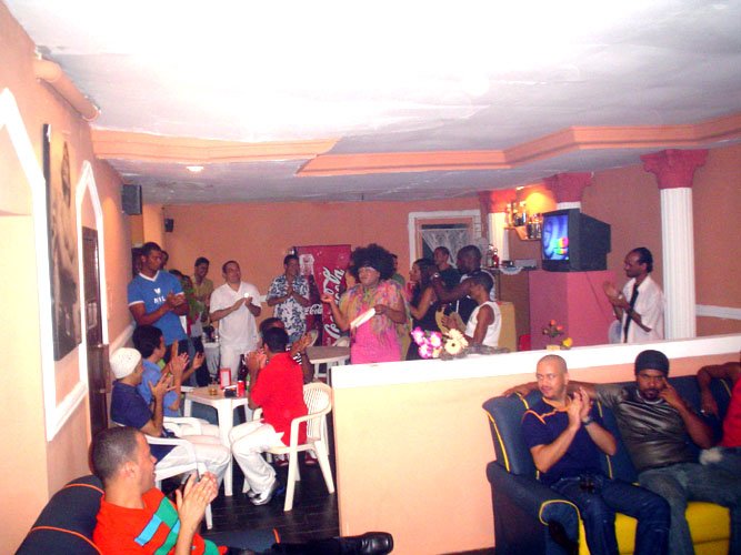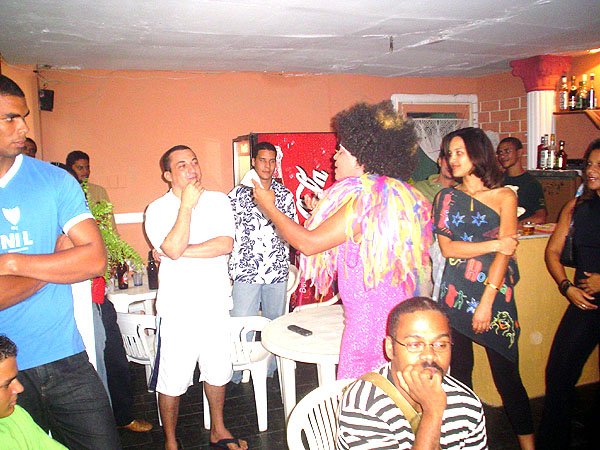 Lá dentro, depois de passado pelo aniversariante todo de branco – de bermuda e no estilo da sua terma a gente se deparava com uma drag caricata que lhe passava ao vivo uma mensagem encomendada. Quase morri de risos com o ritmo do arrocha da bicha hilária…super divertido mesmo. Todos adoraram.